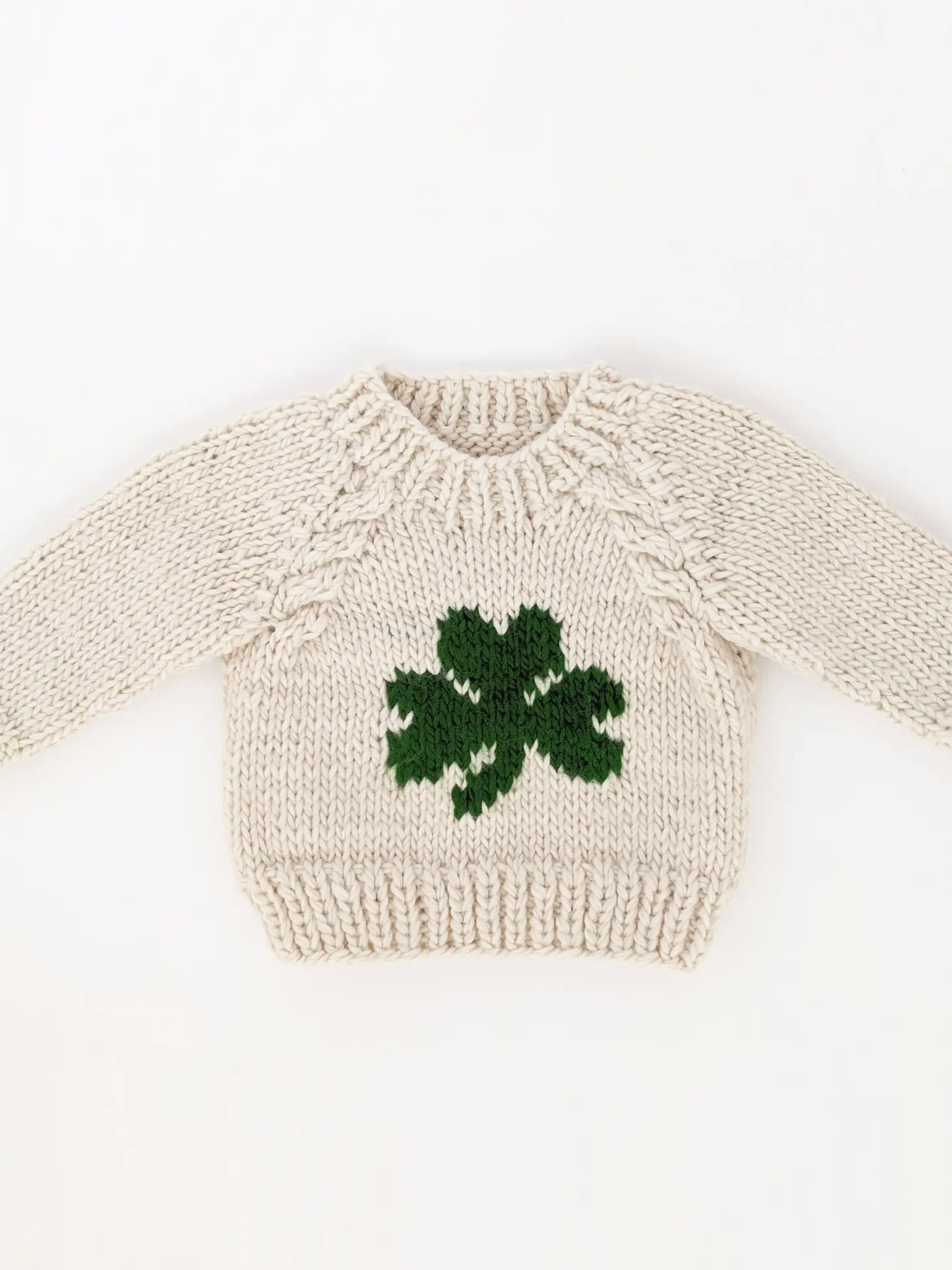 - Hand-knit in chunky yarn, this crew neck sweater in Natural has a Shamrock knit in Kelly Green yarn.