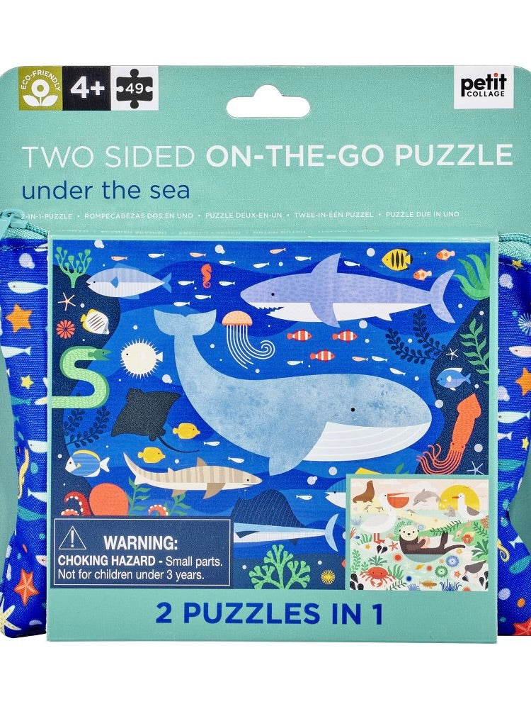 Piece together this Under The Sea Travel Puzzle from Petit Collage and see how many sea creatures you can spot! This charming 49-piece puzzle is two-sided, featuring two unique designs for double the fun! The portable design makes it ideal to take along on trips short and long.
